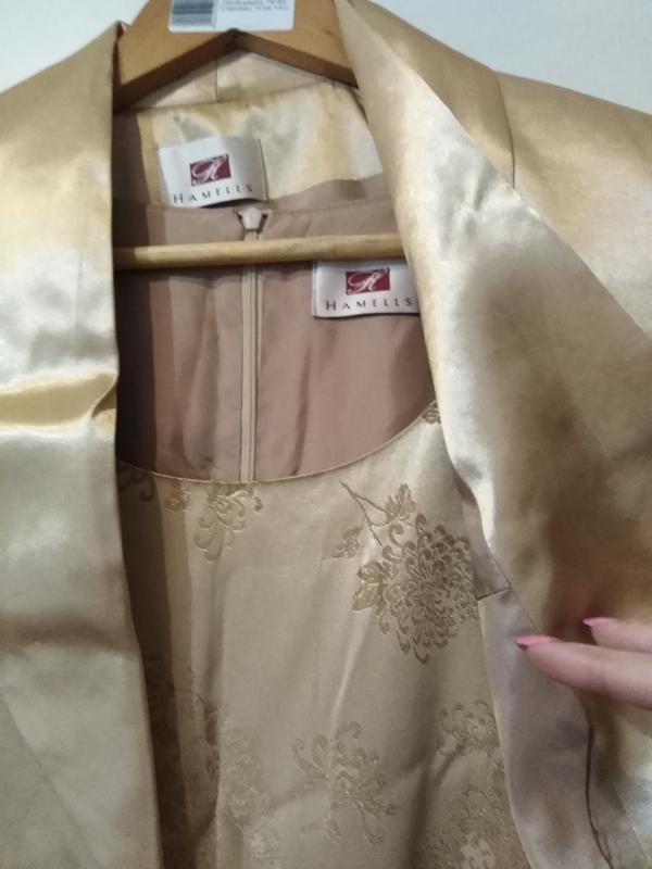 Платье-футляр с коротеньким пиджачком, золотистого цвета, на подкладке. Застегивается на молнию на спине, сзади разрез. На 48 размер примерно, ориентируйтесь на замеры. Длина 131 см, ПОГ - 48 см, ПОТ- 45 см. Пиджачок без застежек, двубортный, с небольшими плечиками. ПОГ - 54 см.