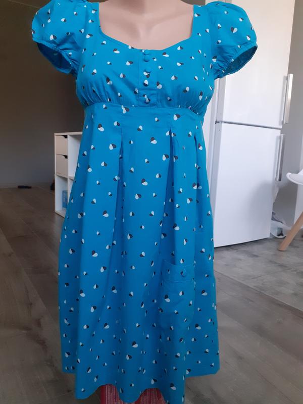 Чудное летнее платьице .Сбоку замочек,спереди кармашек,пуговки,рукава фонарики-всё прекрасно!Замеры: длинна 85, объем груди 85-90,ширина по линии отреза под грудью 36