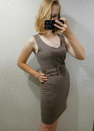 Актуальна сукня в гусячу лапку з пряжкою.