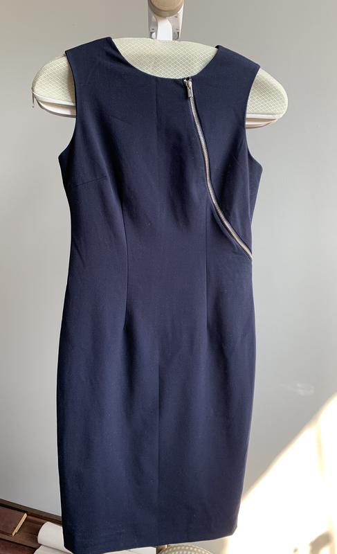 Дуже цікаве плаття синього кольору Calvin Klein. Американський розмір 2, європейський 36. При носці трошки тягнеться. Замочок починається з горловини і по косій проходить до самого низу плаття. На підкладці. Купляла за кордоном. Пів обхват під руками 43 Довжина 94 ПОТ 38 ПОБ 45