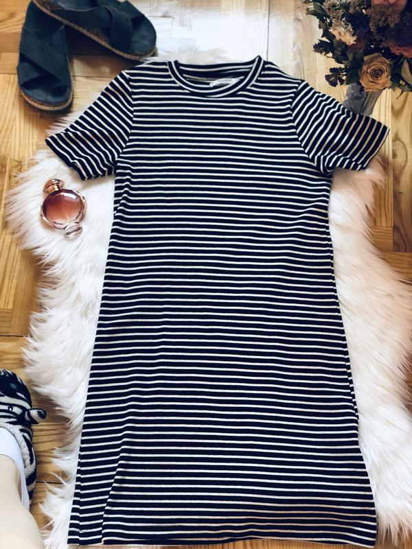 Чорне плаття в білу полоску Розмір S Довжина виробу 82 см, Півобхват грудей 38 см, Півобхват талії 38 см, до низу позширяється Стан новий
