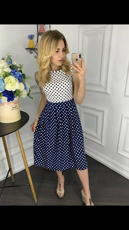 Сукня горох Tasa #113 Ціна:460 грн Розміри:42-44,46-48 Тканина:Шовковий софт Колір: білий верх-низ темно-синій