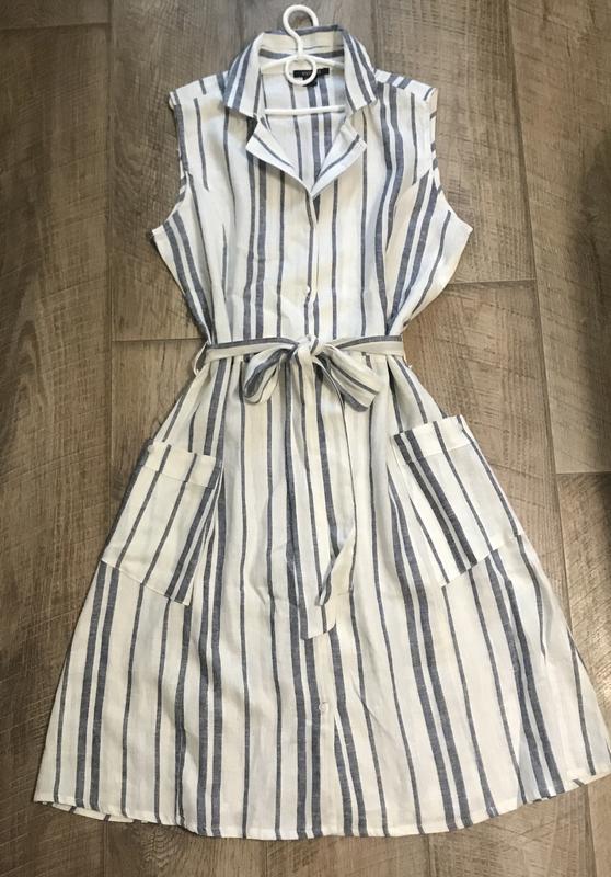 Лляне плаття-халат Esmara з накладними кишенями під пояс. Заміри виробу: довжина-103см,по грудях-54см,талія-49см, стегна-60см.