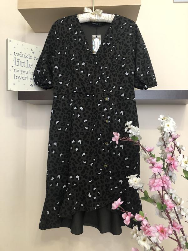 967. Стильное, нарядное и очень красивое асимметричное платье. Размер указан UK14, EUR 42 ( XL ) Подойдёт на L,XL. Бренд Boohoo. Платье вверху идёт на запах. На талии сбоку украшено большими пуговицами. Рукавчики идут на резинке. Платье выглядит очень стильно! ЗАМЕРЫ: -длина от плеча спереди ( до уголка)- 91 см -длина от плеча сзади - 102 см -ширина под руками по спинке - 46,5 см ( полн 93 см) Ткань очень хорошо тянется! -ширина в талии - 42 см ( полн 84 см) -ширина в бёдрах - 57 см ( полн 114 см)
