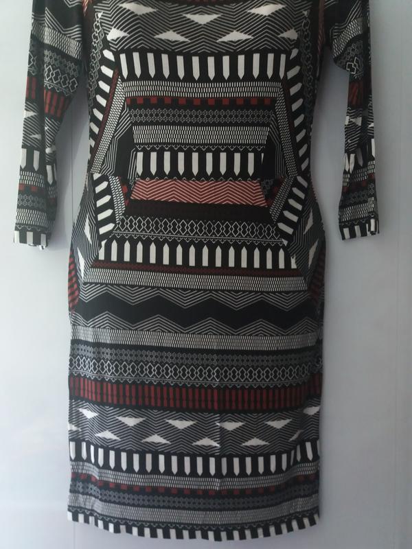 Стильний, оригінальний та ультрамодний геометричний принт – справжня родзинка цієї сукні, одягнувши котру, ви точно не залишитеся не поміченою. Довжина - 102см. Рукав - 51см. Плечі - 40см. Талія - 44 см. Тягнеться. Низ - 49см.