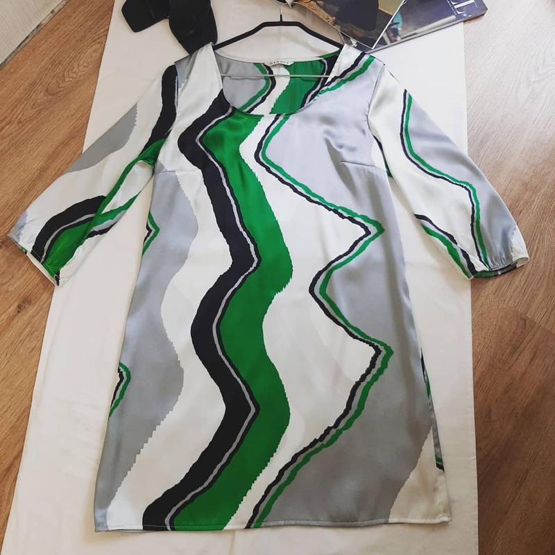 Атласное платье с рукавами 3/4. Состав полиэстер. Минимальные следы носки. Замеры: Длина - 84 см Длина рукава - 45 см ПОТ - 48 см ПОБ - 51 см Ширина по спинке - 50 см