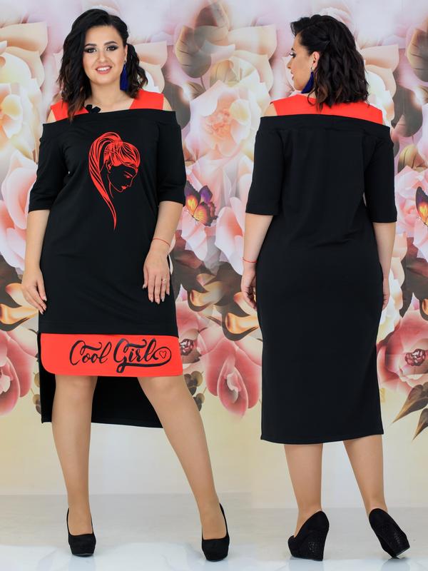 Платье- туника # 108 (Ал-Коз)- (Спорт). Цена- 420 грн. Ткань- двухнитка..аппликация из ткани на специальной клеевой основе. надпись из кожи. Р.ры 46.48.50.52.54. Длина: сзади 118 см...спереди 103см. Норма короче на + - 5см. Рост модели 176см. Дополнительные характеристики: платье-туника свободного кроя. P.S Очень удобное и красивое... Цвет: красный + чёрный.