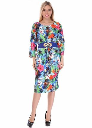 Платье имеет необычный крой. Спереди круглый, а сзади треугольный вырез. Рукав летучая мышь 3/4. Талию подчеркивает синий пояс с золотистой фурнитурой, есть карманы. Верх свободный, ПОТ 48, ПОБ 56( в спокойном состоянии), длина 105 см. Подойдёт на наш 54 размер.