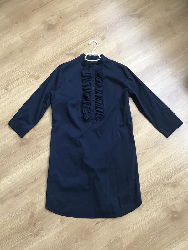 Темно-синее плате Carla Positano, с рукавом 3/4, застежкой по переду и декоративными оборками вдоль застежки. Объем по груди 108 см, объем по талии 99 см, объем по бедрам 104 см, объем по низу112 см, длина платья 94 см, длина плеча 12,5 см, длина рукава 47 см, объем рукава по низу 27 см