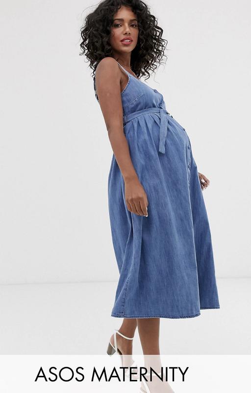 Стильное голубое джинсовое платье сарафан миди с поясом для беременных и не только asos