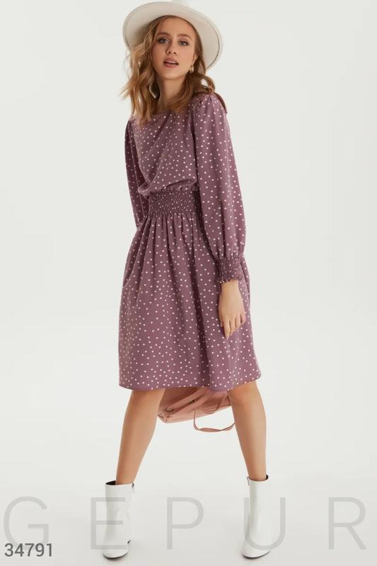 Трендовое платье в мелкий горошек. Круглый вырез, длинный объемный рукав с эластичной манжетой. Эластичная вставка на талии и расклешенная короткая юбка. Длина:102 Рукав (внутренний шов):48 Цвет: пудровый Застёжка:Пуговица сзади Состав:полиэстер - 100%