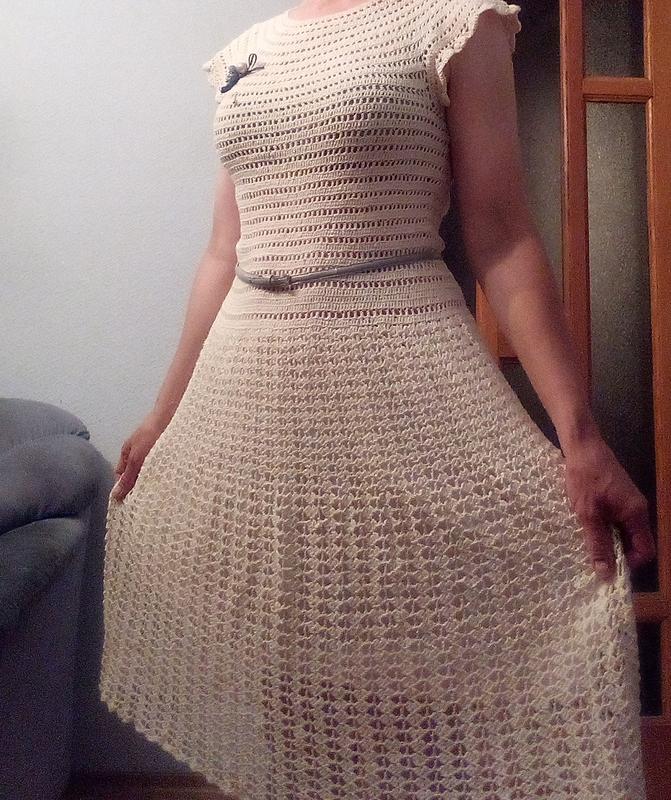 Сукня ручної роботи пов " язане гачком в романтичному стилі з ниток 100% бавовна. заміри на фото. при зрості 164 довжина нижче коліна на 6-8 см. одягнене з нижніх спідниць. Брошка у комплекті.