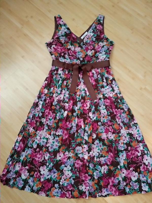 Красиве літнє плаття А-силуету, без рукавів, плісирована спідниця, є підкладка. Можна носити з поясом або без. Розмір 38, склад 100%поліестер. Одягалось один раз.