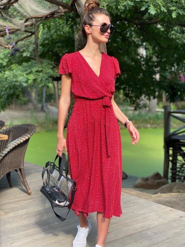 Платье в горошек Мод.3003 Размеры: 42-44, 44-46 46-48, 48-50 Ткань: софт Длина 120 см Платье в талии на резинке, в комплекте пояс Цвета: бежевый, белый, красный и чёрный ав4811