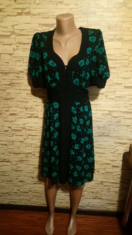 Платье просто великолепное. Ткань тонкая, практически не тянется, на подкладке. Широкий вшитый пояс лента, завязывается на талии сзади. Змейка сбоку. Размер М/L, англ 12. Замеры: ПОГ 47/49, ПОТ 39/41, ПОБ до 57, довжина по центру спини 95 Новое, без нюансов.
