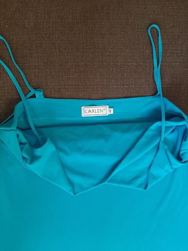 Розмір вказаний:40. Заміри: ПОГ- 42, ПОТ- 36, ПОБ- 44 см, довжина по правому боку -99, по лівому-72. Тканина мікромасло, легка,не мнеться, тягнеться. Колір яскравий, бірюзовий. Бретелі ,на завя'зках позаду, регулюються. Декольте гарно драпірується.