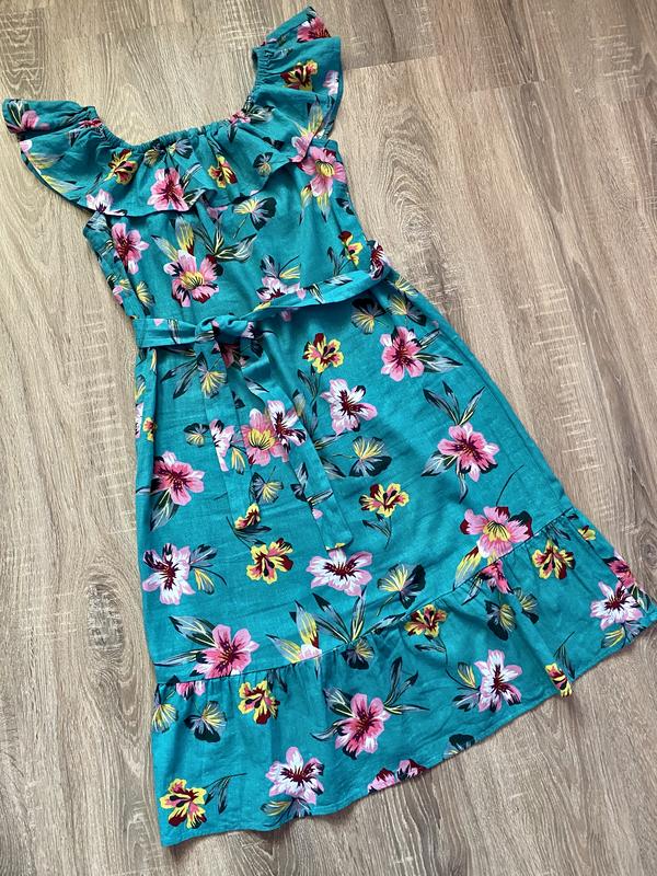 Ідеальне ніжне плаття в квітковий принт. Пошиття пряме, є поясок, яким можна регулювати талію. Можна носити з опущеними плечиками. Натуральна тканина: льон і котон. Пог - 51 Поп - 50 Довжина - 107 Фото на тілі немає. Відправлю після оплати на картку.
