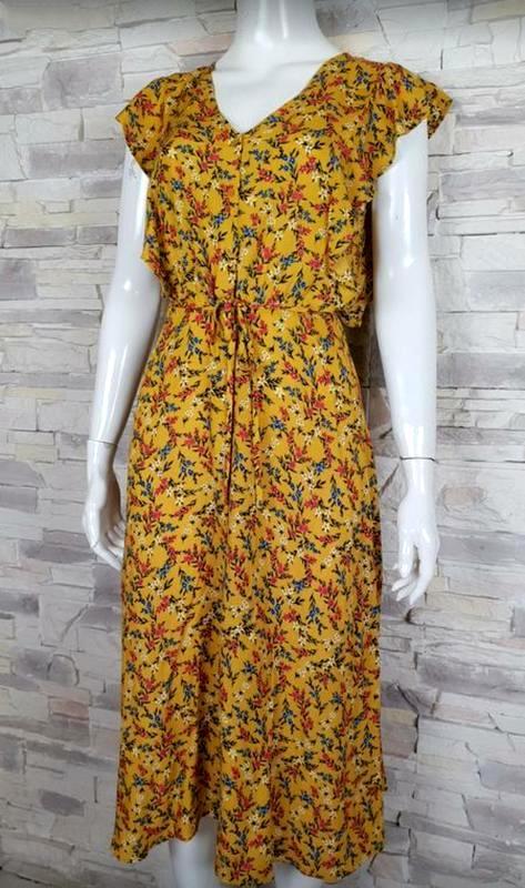 Сукня халат з кежуал колекції F&F в квітковий принт довжини міді. Застібається по переду на гудзики. Тонкий поясок на талії. Розкльошена спідниця. Прекрасно підійде як під кросівки, кеди і т. п., так і під взуття на підборах. ПОГ - 46 см ПОТ - 36 см ( якщо потрібно менше, можна стягти поясом) ПОБІДИ - 60 см Довжина - 122 см Стан супер.