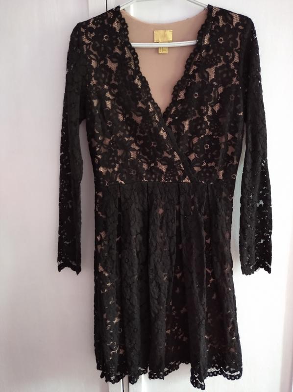Брендове плаття H&M, розм. 36 євро (підійде на S,M), заміри є на фото. Плаття в два шари: зверху чорне мереживо, знизу бежевий трикотаж, на рукавах - тільки мереживо. Збоку прихована блискавка, тому гарно лягає по фігурі. Б/в, але стан нового, дефектів чи недоліків ніяких немає. Виглядає дійсно розкішно! Стане окрасою вашого гардеробу!
