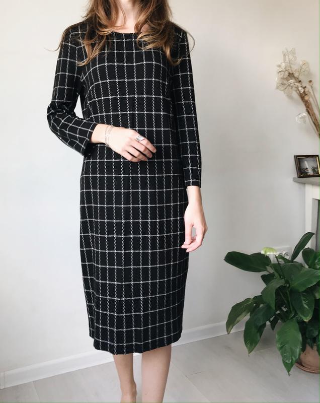 Чёрное деловое платье от стильного бренда. Белая клетка выглядит очень женственно, добавляет изюминку. Базовая вещь. Всегда актуальный дизайн. Мягкое и удобное - приятно ощущается на коже. Длинам платья - 92,5 см Длина рукава - 46 см {3/4} На рост 165 см длина до колена