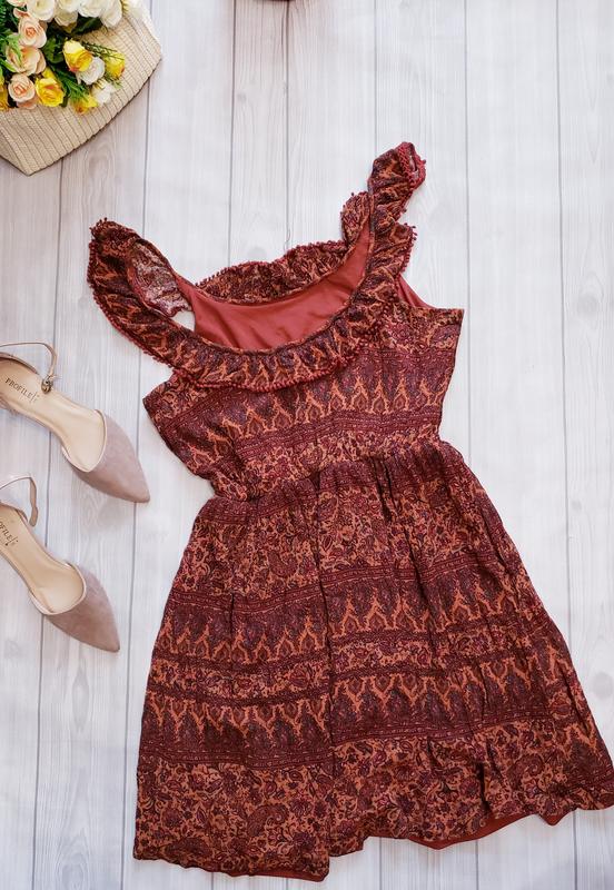 Платье в хорошем состоянии .Оригинальная расцветка,лямочки спускаются на плечи,можно как хочется носить.Материал 100 вискоза,на подкладе. Идет на размер М,в поясе резинка,хорошо тянется,смотрите замерчики: ПОГ 45 см Талия по:резинка максимально растягивается до по42,в свободном состоянии 35 см длина:68 см