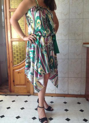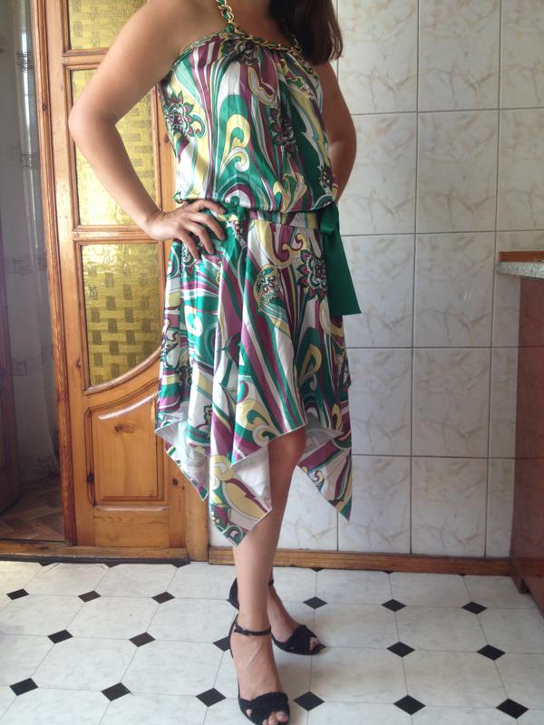 Очень яркий сарафан,горловина красиво отделана цепочкой. пояс и длина регулируется отдельным атласным поясом.Покупалось за дорого.Одето 1 раз на свадьбу.