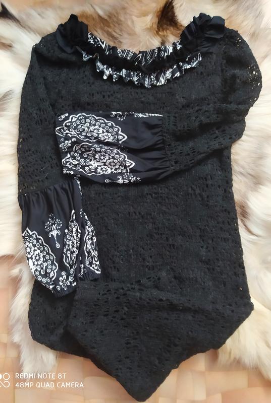 Вещь в идеальном состоянии. Размер 40.Черного цвета, сверху вязка, под низом подкладки. Выглядит супер модно и создаёт индивидуальный неповторимый образ. Рукава дополняют образ платья и делают его шикарным . Замеры: длина - 91см. по плечу-40см пог-44.5см пот-39,5см. поб-46см. низ-50см.