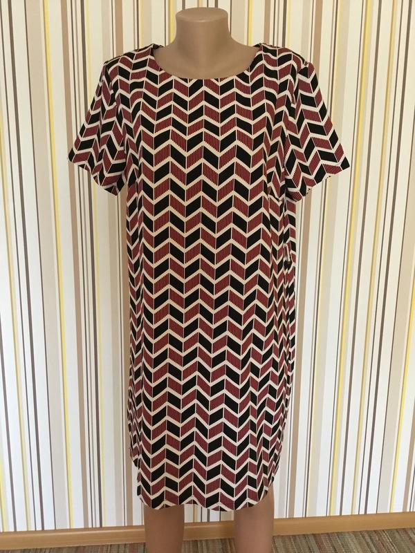 Платье с орнаментом прямого покроя. Есть петельки для пояса ( пояс отсутствует). Нюанс учтён в цене. Замеры: ПоГ 53 см, ПоТ 53 см, ПоБ 56 см. Длина 93 см. Плечи 42 см. Состав: 91% полиэстер, 9% эластан.