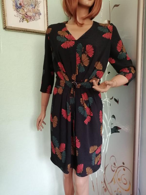 Класне натуральне плаття, підкладка, на мій погляд теж віскоза, гарний осінній принт Бирка зі складом зрізана, на це 100 % віскоза, за типом жакардового шовку Перерезное по талії, спереду йдуть м'які складочки, ззаду блискавка Пог вільно, до 52,піт 34,5,побіди до 54,дл рук 44,шир плечей 39,дл ліфа 43, загальна по спинці 92