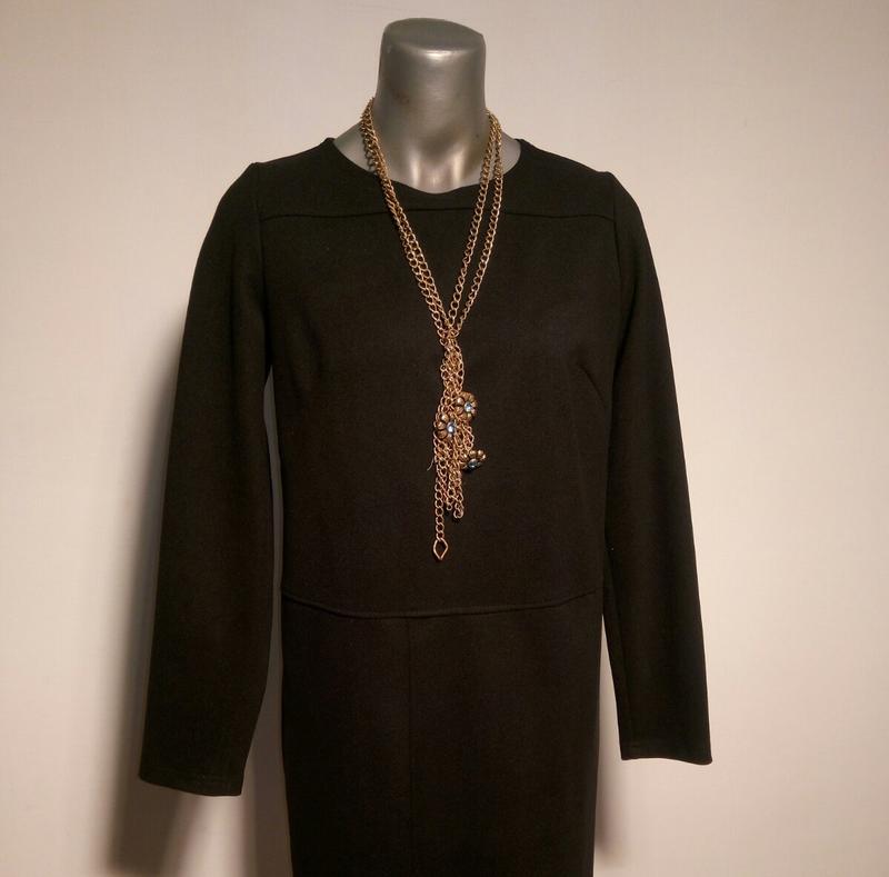 Чорне плаття прямого силуету з щільної теплої тканини. Довгий рукав, переріз нижче талії, трошки приталене по спинці. Є в розмірах від 40 до 56