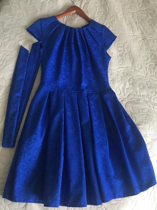 Красиве синє плаття з візерунком. В комплекті є пояс такого ж забарвлення. Розмір М. Тканина не мнеться. Заміри: Плечі - 36 см ПОГ - 43 см ПОТ - 37 см Довжина - 88 см