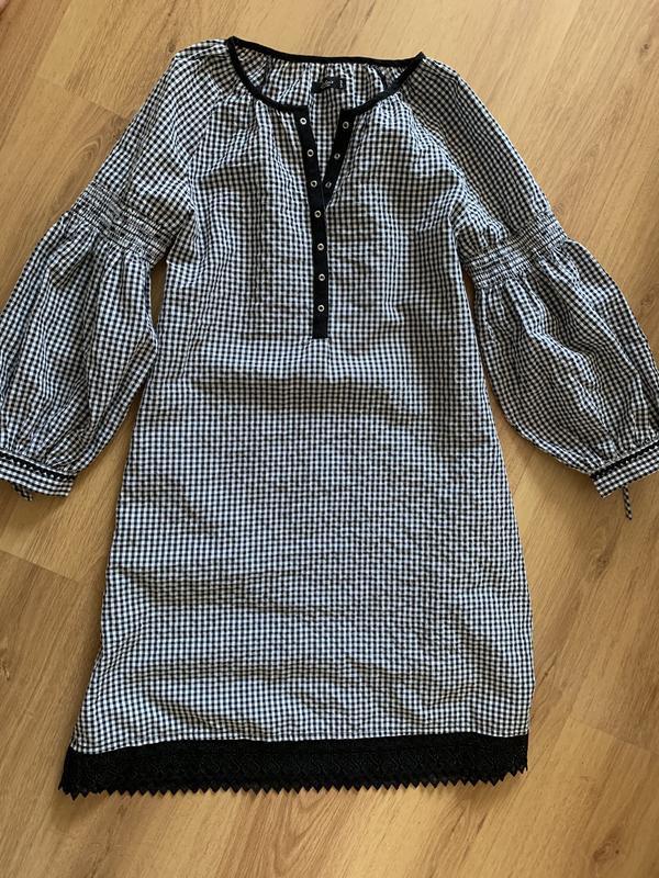 Платье в мелкую клеточку, внизу кружево, ткань жатка.