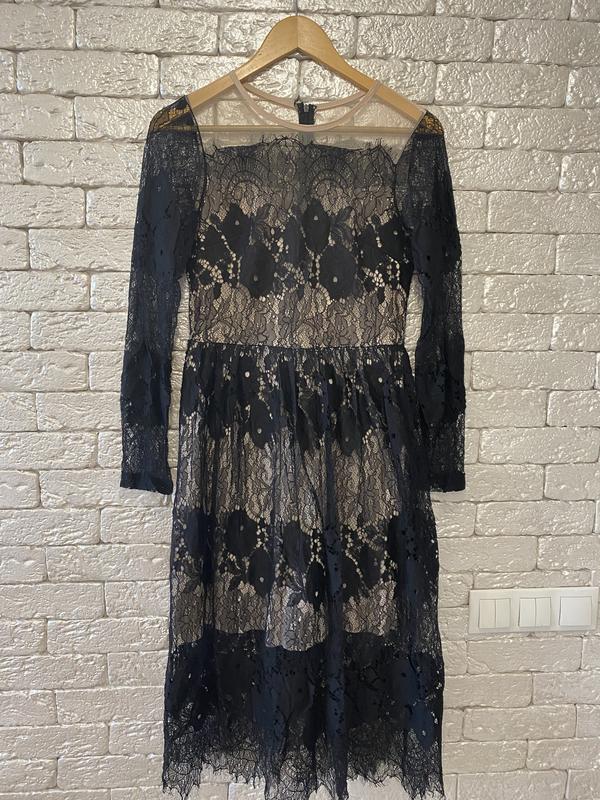 Кружевное платье, праздничное. Чёрное кружево на бежевой подкладке, размер s