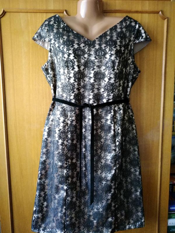 Красивое брендовое платье из тонкого черного кружева на бежевой подкладке. Имеется бархатистый поясок (можно надевать и без него). Ззаду блискавка і шліца. Размер 79618/eur46, по замерам: длина 101 см., плечи 41 см., рукавчик 11 см., ПОГ 55 см., ПОТ 50 см., ПОБ 58 см, низ 55 см.