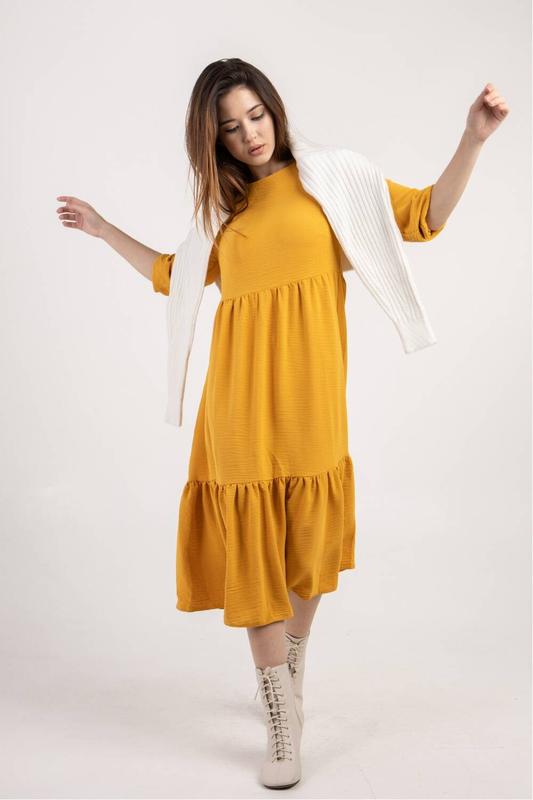 Жіноча сукня виконана з натуральної жатої тканини. Рукав 3/4. Застібається на блискавку. Склад тканини: 60% віскоза, 38%хлопок, 2%еластан