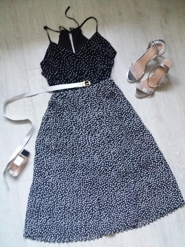 Платье в горошек миди B.you.14р Юбка плиссэ Подкладка.Пояс не предназначен..но положу в подарок..так интереснее Дл 120.топ 43(регулируется)пог 50.пот 40.плб 55(по подкладке)верх любой полиэст.