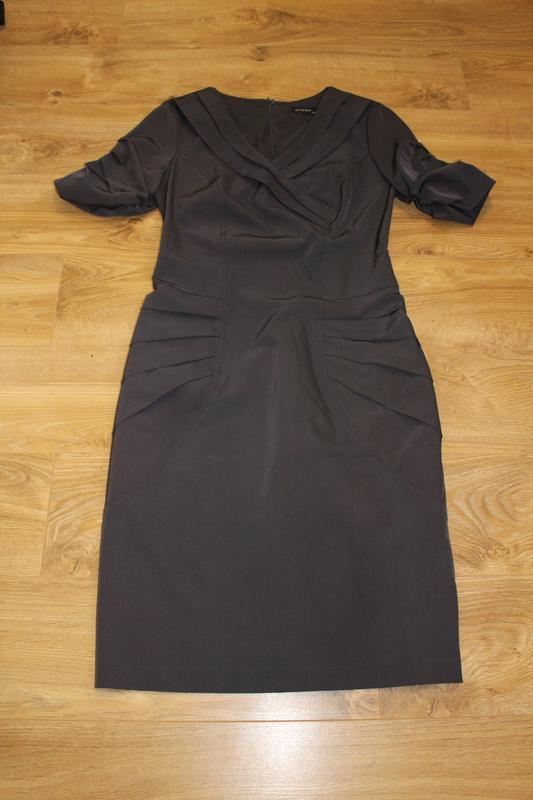 Платье цвета графит Vivento по фигуре. Наряд из плотного гладкого материала с драпировкой на груди, на бедрах и на рукавах. На рукавах также есть металлический декор. Сзади потайная молния. Платье очень красивое, фото не передает Бренд Vivento (Турция) Состав: полиэстер 97%, эластан 3% Дополнительные фото и замеры по запросу
