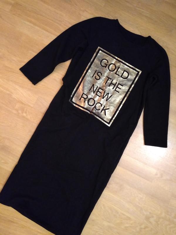 Отличное чёрное платье, ткань плотная. с карманами, золотая надпись рукав 3/4 длина 1м размер примерно м, л но можно и на с