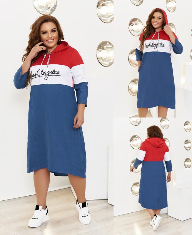 Платье елис Модель : 4141 - Размеры: 1(48-50), 2(52-54), 3(56-58) - Длина по спинке: 113 см - Рукав: 44 см - Материал: турецкая 2-х нить в комбинации с джинс - Цвета: карамель, синий, красный - Цена : 530 грн