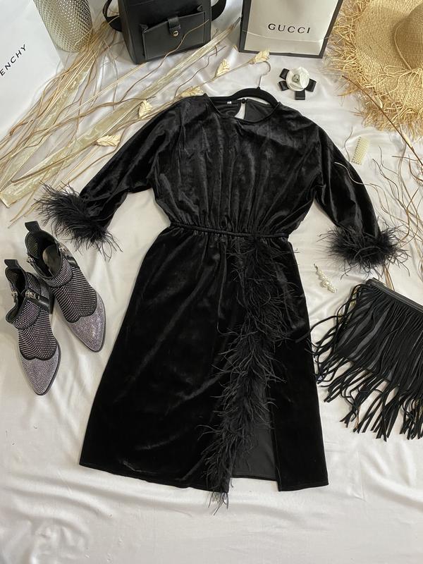 Шикарне, ексклюзивне, оксамитове плаття з пір'ям страуса. Там де розріз на нозі. ще йде підкладка. . Підійде на розмір С, М