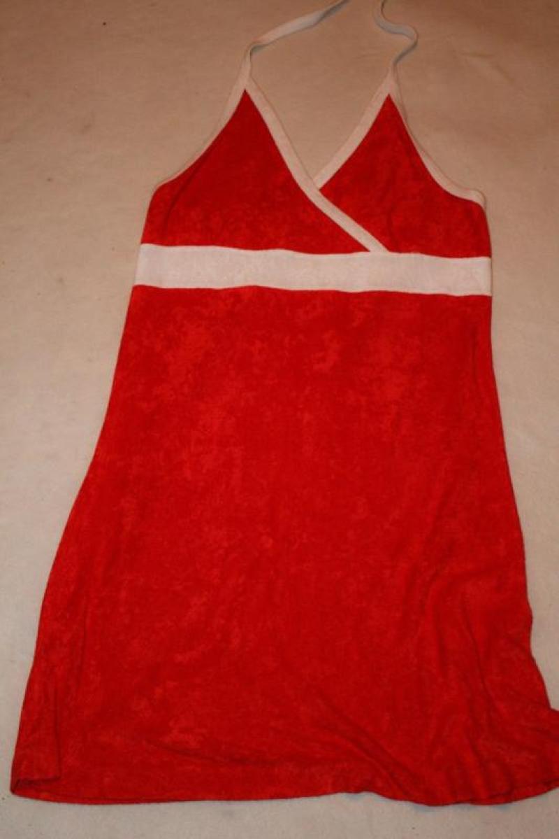 Сарафан красный с белыми ставками и завязкой. Пошит в форме "трапеция". Красиво подчеркивает грудь. Ткань - мягкая, не мнется. Идеально после ванны, ткань хорошо впитывает воду.