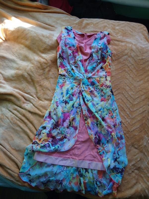 Шикарное платье пошито как с накидкой. Указан 48 размер. Длина перед по юбке 90, сзади по накидке 108. ПОГ 44. ПОБ 54.