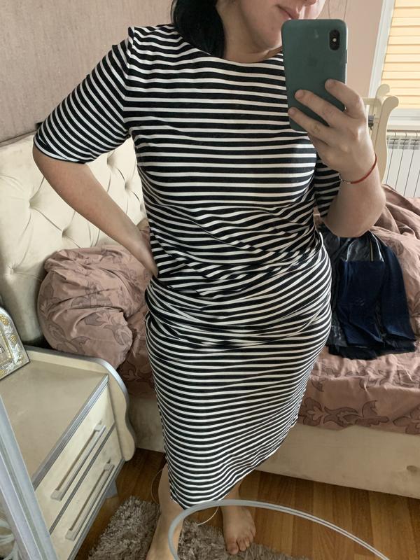 Плаття міді в полоску, дуже класно підкреслює фігуру, за рахунок складок на животі скриває животик