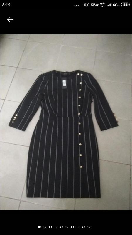 Новое!!! Очень стильное чёрное платье в тонкую белую полоску Стрейч Рукава 3 /4 Пуговицы расстегиваются только в верхней части платья Нижние пуговицы в юбке декоративные С боку на английском замке Д-88см Ширина от подмышки к подмышки - 45см Пояс - 36см Рукава 3 /4-45см Плечи - 33см Бёдра - 46см