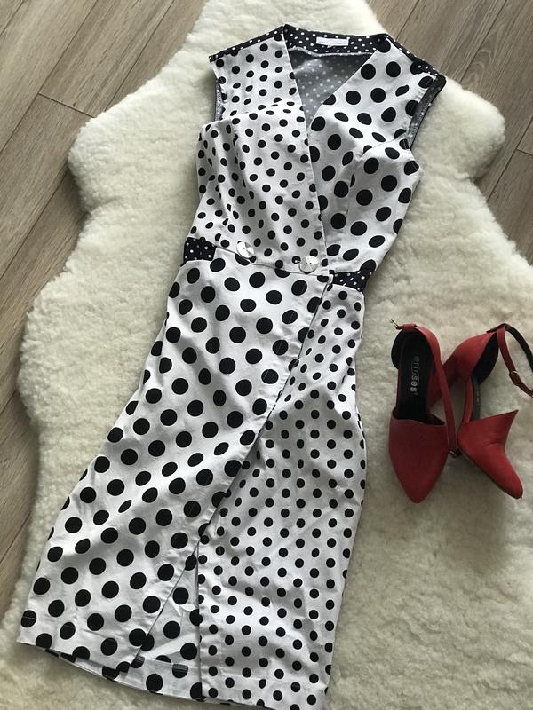 Лляне плаття в горох на запах з кишенями. Цікавий крій по фігурі. Розмір XS