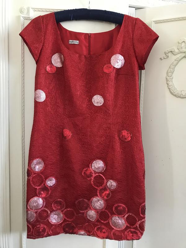 Нарядное красное платье от испанского бренда. Очень эффектное и необычное. Отличный состав:вискоза/полиэстер. Красивый декор по всему платью:круги из паеток.Само полотно выполнено как из паутины. . Размер по бирке -46. Замеры:длина-95 см, ПОГ-51 см, ПОТ -46 см, ПОБ -54 см. Очень нарядное!