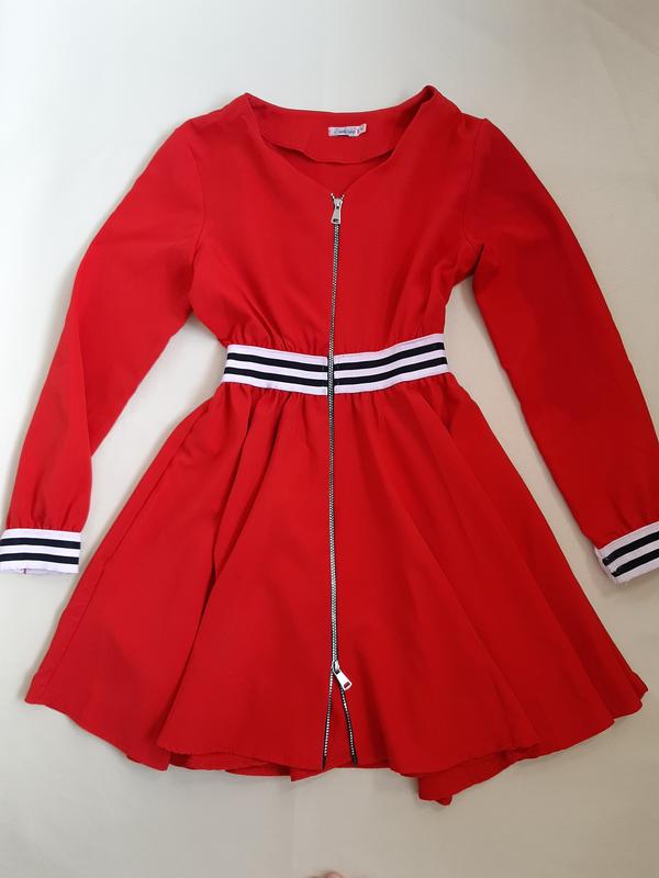 Оригинальное, стильное, спортивное платье из костюмной ткани. Модель приталенная, с пышной юбкой, поясом - резинкой и длинными рукавами. Оснащено молнией через всю длину, декорировано контрастными полосками. размер 46" качество ткани очень хорошее из дефектов только манжеты, их можно исправить, либо просто убрать их вовсе) Замеры полуобхват: резинка в талии-34 тянется до 38 грудь-50 длина-88 плечи-42 рукав-62