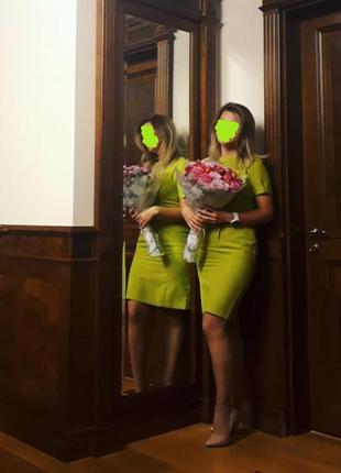 Ділове, офісне плаття приємного зеленого кольору, ближче до салатового. Спереду дві квадратні накладні кишені. Ззаду розріз. Виглядає дуже вишукано. Ніби і строге, а колір ніжний, весняний. Стан прекрасний. На фігурі виглядає супер. Вдягнуте раза 2, поправилась, більше не налазить (((( Довжина - 94 Між підмишками - 42 Талія - 32 Стегна - 46