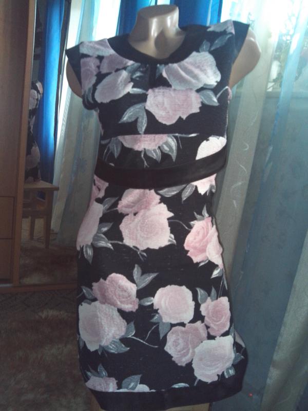 Гарне чорне плаття-міді з принтом троянд, атласними вставками по низу, горловині, рукавчиках, під грудьми. На фігурці виглядає приголомшливо красиво! Розмір вказано 42, заміри: довжина 90 см, плечі 36 см, ПОГ 42 см, ПОТ 39 см, ПОБІДИ 45 див. Тканина, склад: 100% поліестер, щільний, приємний до тіла, не просвічує, майже НЕ тягнеться, за типом бандажної, відмінно підтягує і стрункий;-)! Б\у, у відмінному стані. Запитуйте, будь ласка, дууже красива і відмінно підкреслює фігурку;-)! Доставка УП ( + 20 грн. ) або НП;-)...