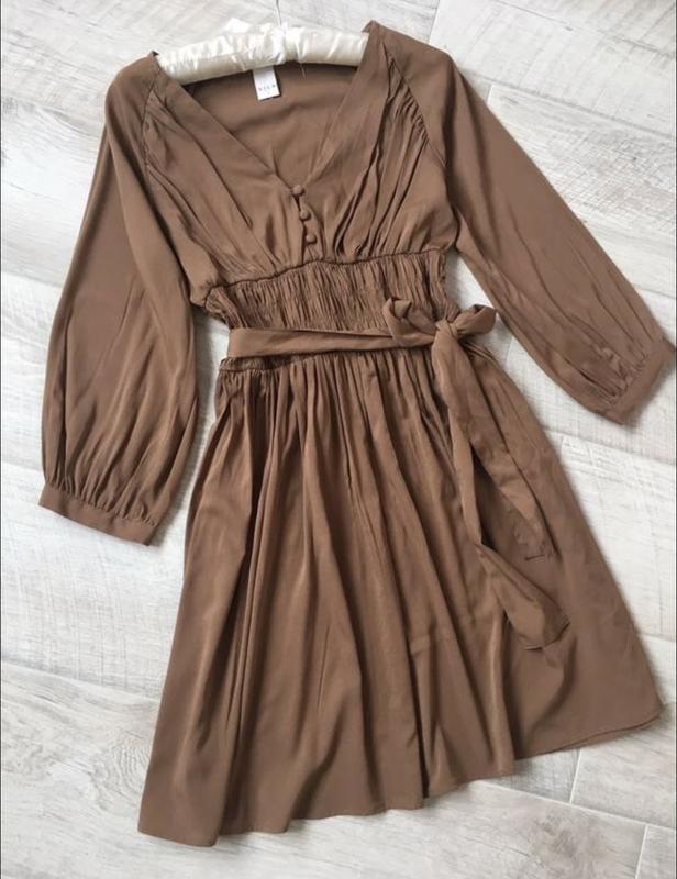 Шикарное платье из сатина медного цвета с красивым переливом, плотная летящая ткань. Красивый вырез с пуговками, талия подчеркнута резинкой и поясом, от талии идет А силуэтом . Рукав браслетный фонариком. Очень красиво и дорого Надевала один раз на вечеринку . Размер С 8 стандарт Длина 86 см ОГ 86-89 см ОТ до 74 см ОБ любое подойдет! Мои параметры рост 177 84-65-90